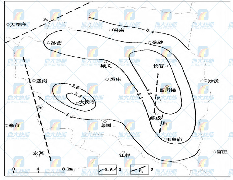 根據地溫梯度計算, 500 m埋深地溫變化范圍32~35℃, 1000 m埋深地溫變化范圍48~54℃。500 m埋深大于34℃的高溫區及1000 m埋深大于52℃的高溫區主要分布在長智-四所樓-練成-玉皇廟及大崗李一帶。地溫垂向上隨地層深度增加而增大, 300~500m深度為25~35℃;500~700 m深度為31~40℃;700~1000 m深度為40~53℃;推算1400 m深度地溫達60℃左右。