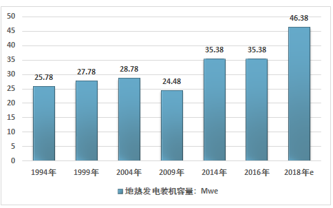 截止2018年年底,中國地區地熱發電累計裝機約46.38MWe。