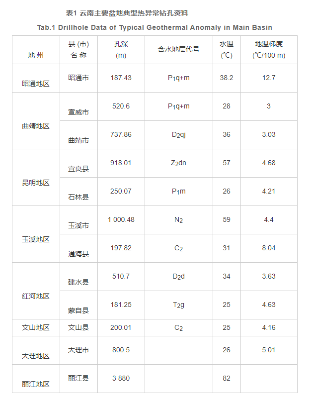 云南中低溫水熱活動區(qū), 主要分布在滇東斷陷盆地中, 水溫相對較低, 但流量大, 共有地?zé)?/a>泉260余處, 地?zé)?/a>鉆孔100多個, 熱泉天然熱流量7.8×104卡/秒, 泉流量4.9米3/秒。以往的勘探成果顯示, 昆明、玉溪、曲靖、昭通、紅河、文山地區(qū)的很多盆地中, 都存在有儲量較大的地?zé)崽?/a> (表1) 。
